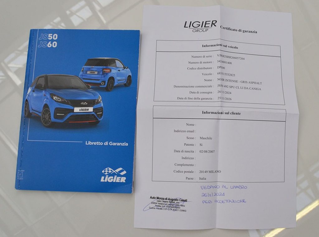 BELLISSIMA LIGIER JS 50 SPORT ULTIMATE ICE TEC CON SOLI 2900 KM, APPARTENUTA AD UN UNICO PROPRIETARIO, GARANZIA UFFICIALE SINO A NOVEMBRE 2026, COMPLETA DI DOPPIE CHIAVI E LIBRETTI USO E MANUTENZIONE, FATTURABILE CON IVA ESPOSTA.